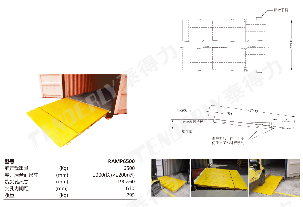 ● 坡道平台带有货叉孔,斜坡部分可以折叠,便于运输