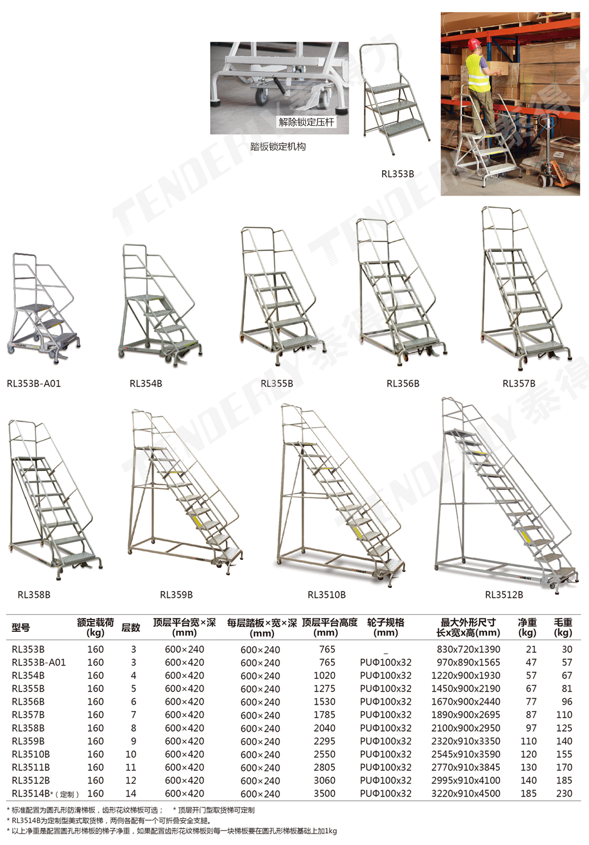 ● 配置泰得力踏板锁定机构,踩压底部踏板可自动固定梯子